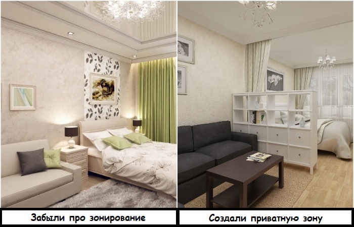Единственно верное решение в данной ситуации – обеспечить грамотное зонирование, отделив спальную зону от общей. Для этих целей дизайнеры рекомендуют использовать стеклянные перегородки, деревянные рейки, ширмы. Также подойдет обычная плотная штора или стеллаж. Старайтесь, чтобы перегородка не была глухой, иначе во вторую часть комнаты не будет попадать солнечный свет.