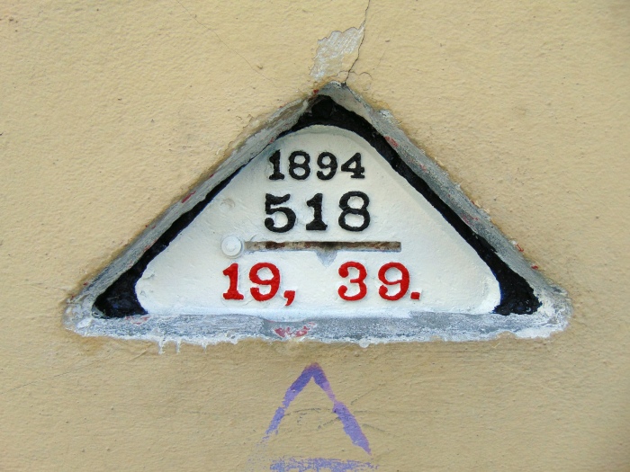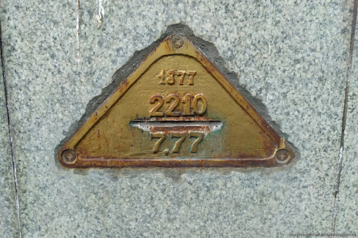 На фасадах зданий есть много всего интересного, что может рассказать современным людям об истории этих зданий. Одна из таких вещей — загадочные треугольники. Первое, о чём можно подумать, что это отметка какого-нибудь очередного затопления. Но всё совсем не так. Они соверешенно разные, имеют разнообразные формы от круглых до треугольных и на самом деле обозначают высоту над уровнем моря. В России высота определяется относительно Кронштадтского футштока, то есть по Балтийскому морю. Это — нивелирная марка.