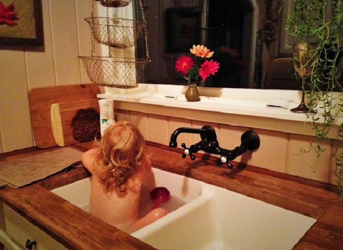 Мойка до сих пор является идеальным местом для водных процедур дочурки. | Фото: tinyhousefor.us.