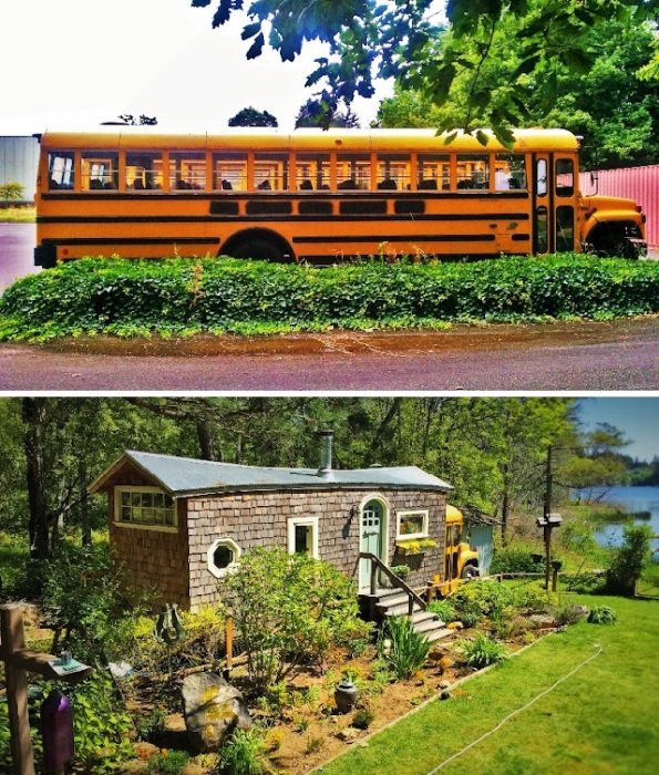 Старый школьный автобус превратился в колоритную лесную хижину.