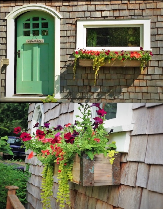После окончания работы, экстерьер дома на колесах действительно вызывает восхищение и делает его непохожим ни на один другой преобразованный школьный автобус. Кедровый сайдинг с шахматным рисунком помог разбить длинные прямые линии автобуса, а имитация провисшей крыши помогает отвлечься от того, что дом представляет собой узкий и длинный прямоугольник. Положительным моментом является и то, что натуральное дерево не обработано лакокрасочными материалами, чтобы весь сайдинг обветрился, выгорел и стал серебристым. Не забыли установить и цветочные ящики под каждым окном, чтобы придать своему крошечному домику деревенский колорит и создать приятную атмосферу. В итоге получилась оригинальная лесная хижина, как из иллюстраций к народным сказкам.
