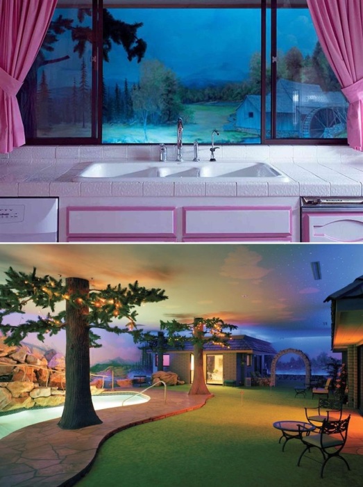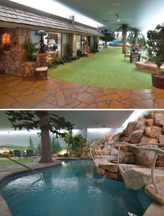 В подземную резиденцию, площадь которой достигает значительных 465 кв. м, можно попасть на лифте и по внутренней лестнице прямо из дома, что очень даже кстати не только в период бомбардировок. Любые народные волнения или налет головорезов владельцам недвижимости с секретом были не страшны. При этом они оказывались не только в полной безопасности, их пребывание было более чем комфортным. Гостиная, столовая, полностью оборудованная кухня, пять спален, шесть ванных комнат, бассейн, живописные пейзажи за «окном», внутренний дворик с искусственной травой, деревьями и цветами, декоративное освещение, имитирующее дневной свет, сумерки, лунный свет, рассвет – здесь есть все, чтобы без проблем и в приятной обстановке пережить любую глобальную катастрофу.