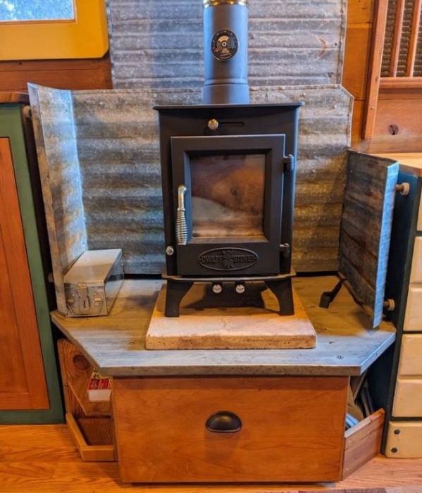 С другой стороны кухни предусмотрена крошечная ванная, ограниченная скромных размеров душевой кабиной, снаружи облицованной деревом, а вот внутри листами оцинкованной стали. Да, такой дизайн не порадует высокой эстетикой, но зато будет долговечным и практичным. Для установки биотуалета также найдется уголок, который можно легко будет заменить на смывной унитаз, если крошечный дом планируют использовать как парковую модель там, где есть возможность подключиться к центральным инженерным коммуникациям.