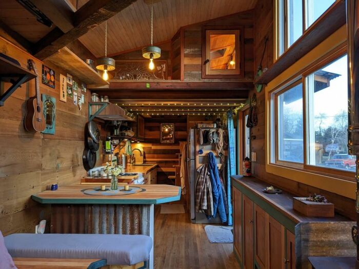 При оформлении интерьера Craftsman использовали только натуральное дерево, пропитку и утеплители. | Фото: tinyhomebuilders.com.