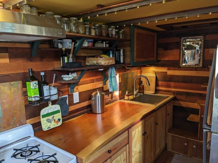 Если говорить о планировке, то прямо у порога находится отлично укомплектованная кухня со встроенным мебельным гарнитуром, который также изготавливался из восстановленной древесины. Его форма и функциональные возможности несколько отличаются от традиционных моделей, и все это делалось по одной причине – обустроить эргономичное пространство. Оно не должно был загроможденном, но при этом максимально удобным, а мебель вместительной, ведь дом рассчитан и на длительные путешествия, и на постоянное проживание, если возникнет такая необходимость. Для приготовления пищи и ее хранения были установлены и соответствующие предметы бытовой техники и оборудования.