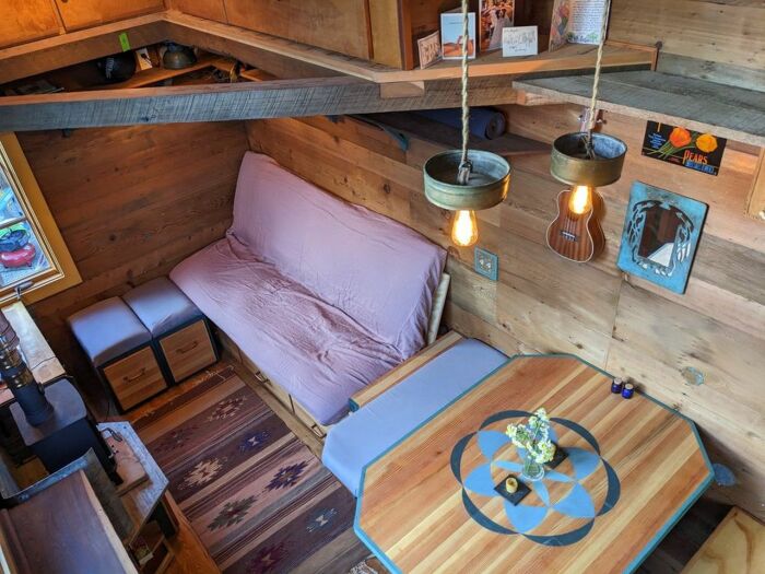 Гостиная-столовая с диваном-трансформером и обеденным столом. | Фото: tinyhousetalk.com.