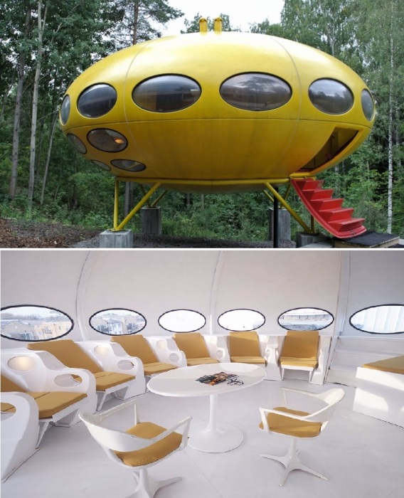 Поистине культовая капсула под названием Futuro появилась на нашей планете, причем в различных ее уголках, благодаря финскому архитектору Матти Сууронену, спроектировавшему ее в середине 1960-х. Модульный переносной домик, напоминающий выдуманный художниками и киношниками инопланетный корабль, был изготовлен из стеклонаполненной полиэфирной смолы. Его интерьер поддерживает космическую тематику с помощью шести раскладных кресел на подставках, расположенных вокруг «костровой ямы». При этом имелся отсек с туалетом и душевой, а удивительное пространство капсулы нагревалось и наполнялось свежим воздухом с помощью воздушных каналов, проходящих под полом.