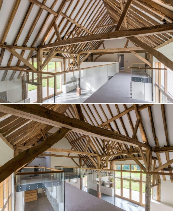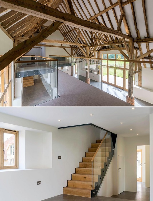 Чтобы не закрывать виды на затейливую стропильную конструкцию, дизайнеры предусмотрели стеклянные ограждения на лестничных маршах и втором уровне, частично занимающем периметр амбара. При отделке стен использовали старинные методы штукатурки и побелку, а вот полы все-таки сделали из полированного бетона, ведь для современного жилища площадью в 250 кв. метров утрамбованная земля была бы перебором. На втором же уровне использовали ковровое покрытие высокого качества, чтобы обстановка в спальной части была более домашней и уютной.