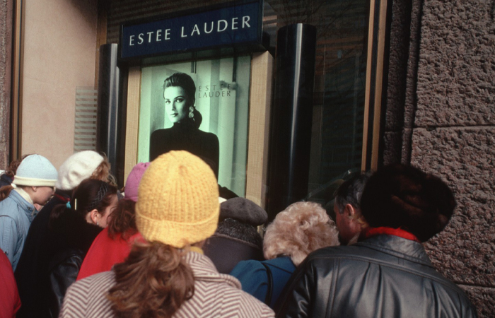 Первый магазин американской компании/ фото: super.ru В конце 80-х в Москве появился первый магазин американской компании «Эсте Лаудер», который специализировался на продаже парфюмерии, косметике и средств по уходу за волосами. Однако и в этом магазин попасть могли не все граждане. Руководство магазина выдавало специальное приглашение. Счастливые обладательницы заветной открытки могли купить косметику для макияжа. Пудра от Lancome в золотой коробочке стала фаворитом у советских модниц. Женщины носили ее в сумочке, чтобы произвести впечатление при удобном случае. И если пудра заканчивалась, то пустая коробочка не выбрасывалась — она оставалась лежать в косметичке. Спрос на пудру Lancome был настолько велик, что частные торговцы продавали ее за бешеные деньги. В магазине пудра стоила 25 рублей (при зарплате 180 рублей), у фарцовщиков — 50 рублей.