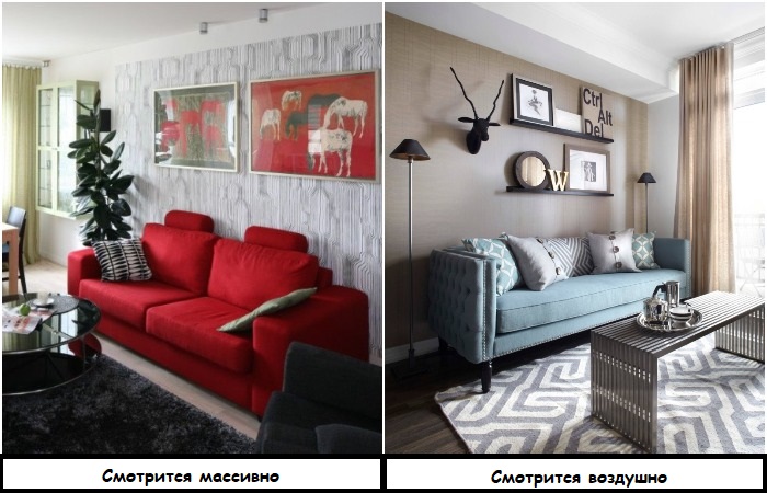 В большинстве квартир именно диван является центральным элементом гостиной, поэтому к его выбору следует подходить с особой тщательностью. Важно, чтобы его размер был пропорционален комнате, а не занимал ее большую часть. Также советуем выбрать модель на ножках – это отличная возможность добавить помещению больше воздуха и легкости, ведь между полом и обивкой будет проникать свет.