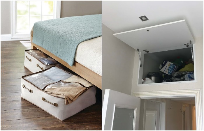 В каждой квартире есть места, которые редко кто рассматривает для хранения, и очень зря, ведь в малогабаритках они являются настоящим спасением. Прежде всего речь идет о зонах под потолком и на линии пола. Используйте по максимуму место под кроватью – храните там сезонную одежду и обувь, запасные постельные принадлежности, прочитанные книги, к которым планируете вернуться, новогодние украшения для елки и квартиры, и пр. Для хранения подойдут корзины, коробки, ящики на колесиках – главное, чтобы они подходили по высоте и ширине. Пригодится и антресоль – да-да, та самая, которая была в квартире у вашей бабушки. Она может быть встроенная или комбинированная с отдельно стоящим шкафом. Выбирая кухонный гарнитур, отдавайте предпочтение моделям с третьим рядом шкафчиков до потолка, в которых можно хранить редко используемую посуду, бытовую технику и текстиль.