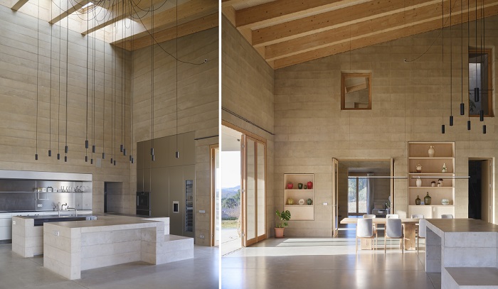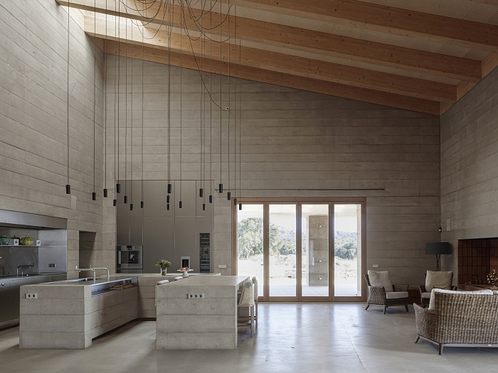 Кухня является многофункциональным пространством, поскольку помимо мебельного гарнитура с основательной рабочей зоной, вместительными системами хранения, кухонным островом и необходимым оборудованием для приготовления пищи, имеется еще столовая и лаундж-зона. Здесь можно запросто устраивать кулинарные эксперименты, семейные вечера, дегустационные мероприятия и дружеские посиделки, в хорошую погоду перемещаясь на террасу с массивным бетонным козырьком. Поскольку дом занимает вершину холма, неудивительно, что с его высоты открывается потрясающий вид на острова Медес, колоритную сельскую местность Каталонии, сельхозугодья и Средиземное море.