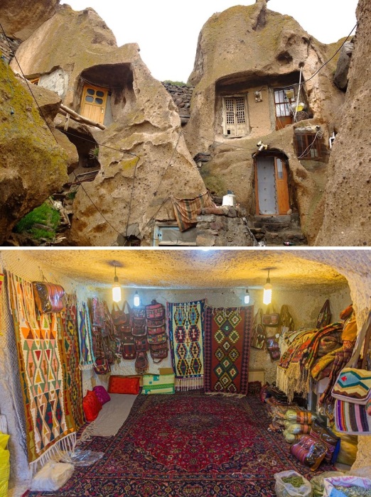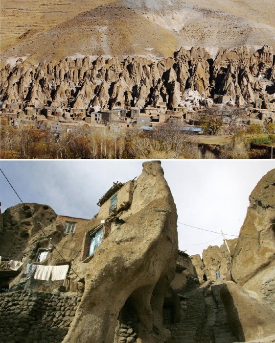 Удивительная деревня Кандован, расположенная у подножия вулкана Саханд, в северо-восточной провинции Ирана, сохранила причудливые жилища, вырезанные в податливой, пористой вулканической породе 700 лет назад беженцами, спасавшимися от монгольских набегов. Эти пещерные дома издревле называли караанами, что с местного диалекта означает «улей». На протяжении веков они защищали жителей деревни от вражеских вторжений, не говоря уже о том, что дома были уютными убежищами, спасая семьи от летних знойных лучей солнца и от холода зимой.