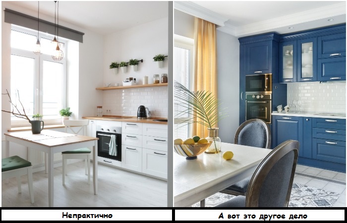 Наверняка ваши брови сейчас удивленно приподнялись, ведь гарнитуры без верхних шкафчиков только недавно стали трендом, как символ легкости, воздушности и стиля. Да, не спорим, дизайнеры активно используют этот прием в своих проектах. Но если взглянуть на ситуацию немного шире, сразу становится понятно, почему при оформлении кухни не следует действовать в угоду трендам. Дело в том, что одной из главных модных тенденций, действующих в интерьере, которая актуальна всегда и везде, – это практичность и функциональность. Именно поэтому решения, которые не отвечают этим характеристикам, очень быстро оказываются на скамье запасных. Гарнитуры без верха, где шкафчики заменяют полки, уместны в редких случаях. Чаще всего они присутствуют на больших кухнях, где нет недостатка мест для хранения. Если же использовать этот прием в маленьких комнатах, они действительно будут выглядеть визуально больше, но вопрос, куда складывать посуду, продукты и бытовую технику останется открытым. При обустройстве кухни старайтесь, в первую очередь, ориентироваться на свои личные потребности, подстраивая интерьер под себя. Шкафчики, полки, рейлинги – выбирайте то, что сделать ВАШ гарнитур практичным и удобным.