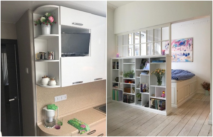 Сами по себе открытые полки имеют очень много плюсов. Они визуально разгружают комнату, делают пространство визуально больше и воздушнее, позволяют хранить на виду стильные вещи, которые украшают интерьер. Однако, если не поддерживать на полках порядок, они автоматически превращаются в самый худший ночной кошмар.