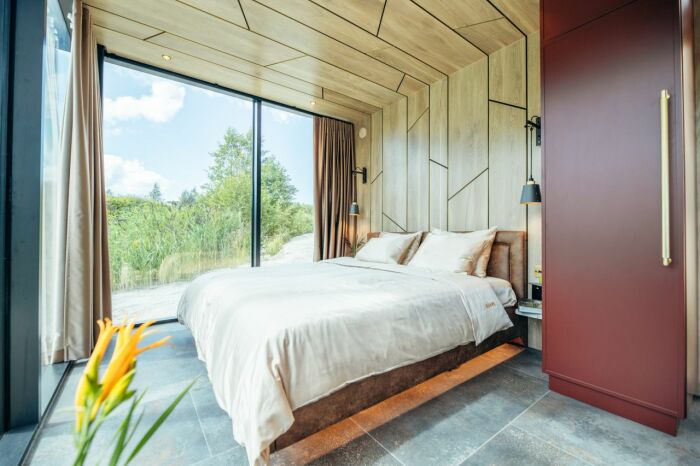 Если же говорить об организации внутреннего пространства, то большую его часть отдали под обустройство спальной зоны. Роскошная двуспальная кровать с двух сторон окружена стеклом, но это никак не влияет на конфиденциальность, поскольку его покрытие не дает возможность уличным зевакам заглянуть внутрь домика. А для тех, кто любит подольше поспать, предусмотрены плотные шторы, которые не дадут солнечным лучам разбудить с утра пораньше. Также они спасут от светового загрязнения, если домик будет находиться в черте города.