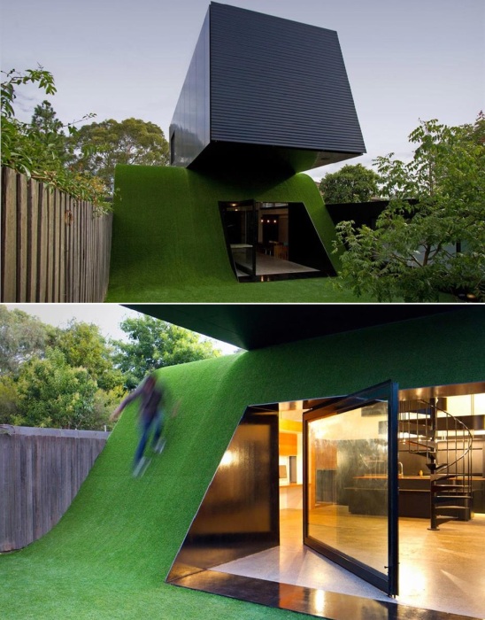 Специалисты архитектурной студии Austin Maynard Architects разработали проект современного дома, который бросает вызов нормам дизайна. Hill House, построенный в одном из жилых районов Мельбурна, является исключительным примером неординарной эстетики и планирования внутреннего пространства. Поскольку Мельбурн, как и остальные крупные города мира, не обошла участь плотной застройки высотными зданиями, было решено отдать как можно больше площади под организацию зеленой лужайки. Благодаря этому стремлению, дом получился действительно оригинальным и инновационным. Большой черный объем, кажется, выступает из склона холма, который, на самом деле, является покрытым травой первым этажом дома.