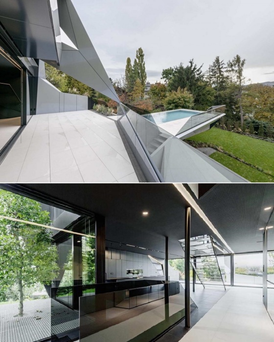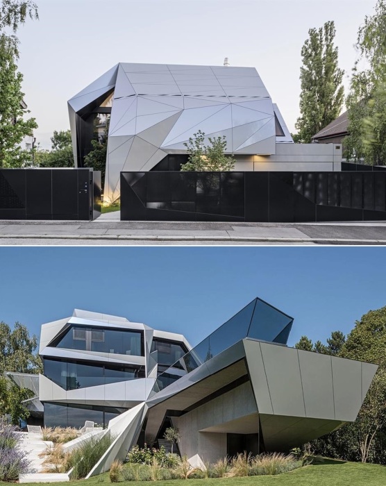 Ультрасовременная резиденция, известная как CoMED, была спроектирована специалистами ad2 architekten ZT KG для владельца пригородного участка Вены. Угловатый, острый и внушительный, дом выделяется на фоне существующей застройки, но при этом прекрасно вписывается в обстановку. «Обернутый» в панели из алюминиевых сегментов Trapesum, отражающих небо и меняющих цвет в зависимости от освещения окружающей обстановки в течение дня, является впечатляющим зрелищем.