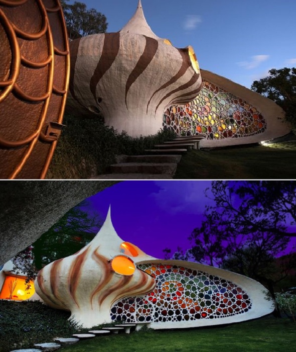 Примечательно: Витражное окно отмечает вход в странный и удивительный дом, уступая место плавному жилому пространству открытой планировки. Пол гостиной превращен в зеленую лужайку, состоящую только из живых растений, имеется даже рукотворный ручей, выходящий прямо на улицу. Окна отбрасывают разноцветные огни, добавляя причудливой атмосферы неординарному внутреннему пространству. А вот стены, полы и потолки, как и экстерьер здания, извиваются и поворачиваются, имитируя структуру морской раковины.