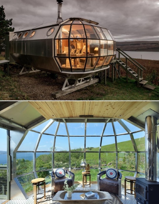 Современный дом, больше похожий на инопланетный корабль, расположен в Дримнине, недалеко от берегов пролива Малл на изрезанном западном побережье Шотландии. Гостевой дом, названный «Современный дирижабль», был спроектирован британским архитектором Родериком Джеймсом, изготовленный из листов алюминия, что придает ему современный и оригинальный вид. Капсулообразная структура с иллюминаторами (включая потолок) и стеклянными стенами окружена 1,6 га земли, что позволяет провести выходные в более чем спокойном месте с невероятными видами на окружающие вершины Хайленда.