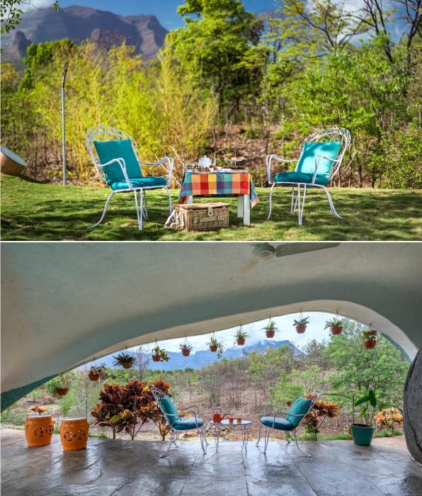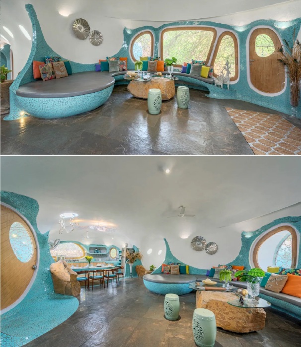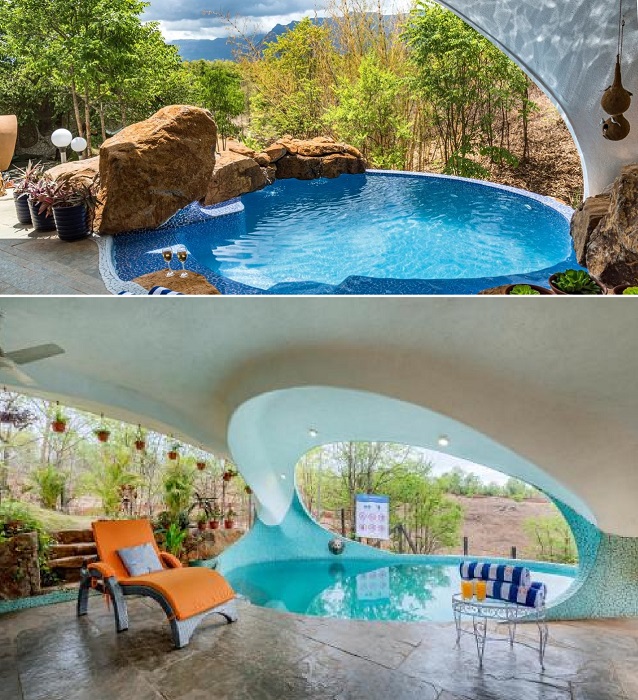 «Хоббичья нора» в штате Махараштра также может похвастаться традиционно узнаваемой круглой дверью, правда, она является тайным ходом. Помимо нее в гостевом доме предусмотрено их сразу три, поскольку два ее фасада находятся по разные стороны холма. Помимо главного входа, к которому ведет тропинка из леса, в гостевом доме имеется еще два – во внутренний дворик и на причудливой формы террасу, где обустроена лаундж-зона у бассейна. На нее можно попасть из двух спален, так что отдыхающим не нужно будет выходить на улицу, чтобы обойти холм и насладиться отдыхом в уличной гостиной, выступающей еще и в роли столовой.