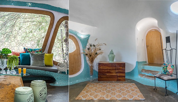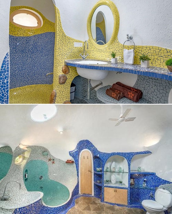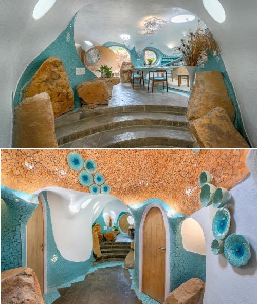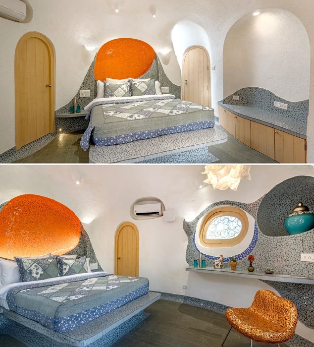 Если говорить о внутреннем пространстве, то здесь, как и в экстерьере не найдешь ни одного острого угла или прямой стены, что делает рукотворный объект более похожим на пещеру. Еще одной особенностью оформления интерьера стали мозаики, украшающие все без исключения жилые зоны. Они ярко выделяются на белом фоне причудливой формы стен и потолков, являясь главными акцентами в дизайне, которые подхватывает и текстиль, отлично согласующийся с общей идеей оформления. В каждой комнате выбор яркого, бросающегося в глаза цвета отличается, а вот серые, голубые и бежевые тона можно увидеть в каждой части Titaly.
