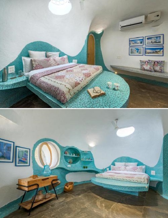 Примечательно: В отличие от первоисточника, индийская «хоббичья нора» имеет необычную конструкцию. Помимо интеграции вглубь холма над входами установлены бетонные навесы, которая стали органичным продолжением импровизированных козырьков, образующих заодно и крытые террасы. А еще на крыше земляного убежища предусмотрено обилие световых люков, которые можно закрыть, если оно пустует. В остальное же время, они и множество круглых окошек, присутствующих и фасадной части Saffronstays Asanja Titaly, наполняют внутреннее пространство солнечным и лунным светом, который и создает причудливые динамичные образы, постоянно меняя восприятие интерьера. Среди потолочных окон имеются и вентиляционные трубы, обеспечивающие каждый уголок подземных помещений свежим воздухом.