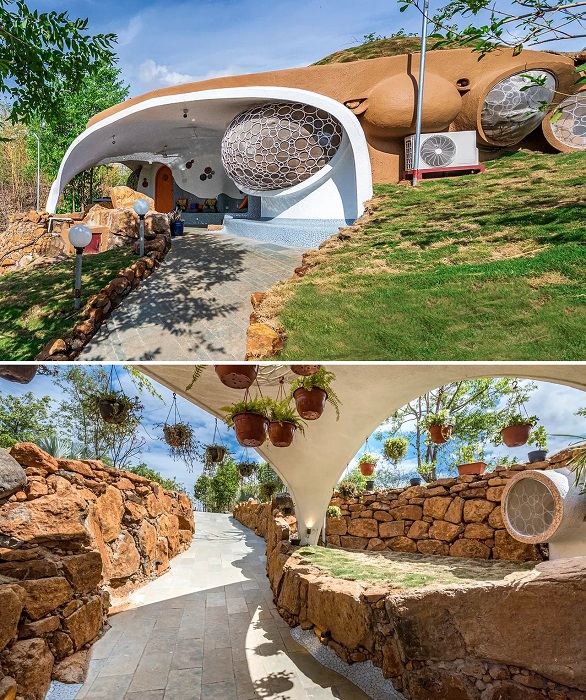 Недавно колоритный гостевой дом под названием Saffronstays Asanja Titaly появился недалеко от Пуны (Индия). Разработанное архитектурной студией AsanjA экологичное убежище, спрятанное в земле и покрытое щедрым травяным покровом, может составить конкуренцию известным Хоббитонам, которые последнее десятилетие привлекает все больше любителей неординарного отдыха. Оживляя фантазию Толкина, специалисты студии сделали все, чтобы обеспечить не только оригинальную эстетику самого объекта, но и создать поистине волшебную обстановку, сочетающуюся с современными удобствами.
