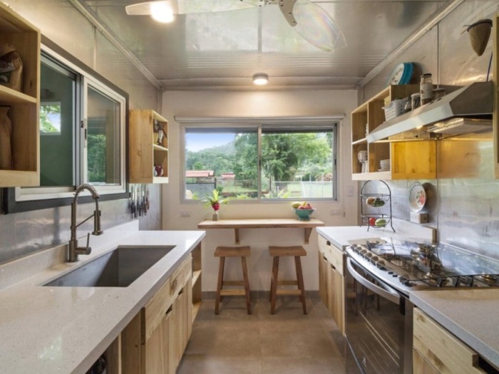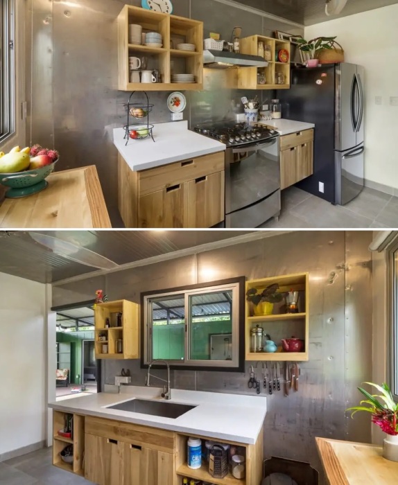 В одном из контейнеров оборудована вполне современная кухня, где есть все, что может понадобиться для приготовления и хранения еды. Поскольку контейнер имеет ограниченную ширину, кухонный гарнитур расположили вдоль противоположных стен. С одной стороны вместительные напольные тумбы, покрытые столешницей разделяет полноразмерная газовая плита с духовым шкафом. С другой – предусмотрена большая врезная мойка, вокруг которой осталось немного рабочего пространства. Вертикальные же плоскости заняты открытыми полками, чтобы все необходимые столовые приборы были под рукой. Торцевая часть, где вырезано окно с видом на экзотическое окружение, выступает в роли небольшой столовой, где можно организовать завтрак на двоих или просто выпить чашечку кофе, наслаждаясь рассветом.