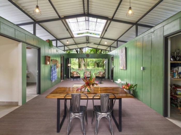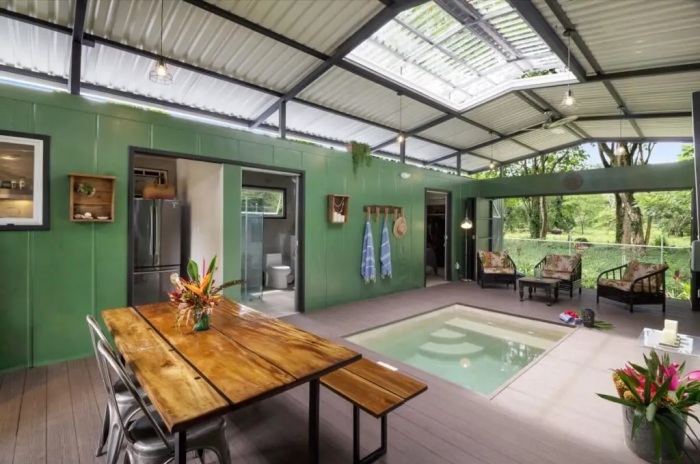 Глядя на гостевой домик, затерянный среди экзотической костариканской природы, сложно поверить, что он построен из грузовых контейнеров. И это немудрено, ведь авторы проекта сделали все, чтобы он максимально гармонировал с окружающим ландшафтом и стал комфортным убежищем для парочки влюбленных или семьи с двумя детьми, прибывших на отдых в один из самых райских уголков на планете.