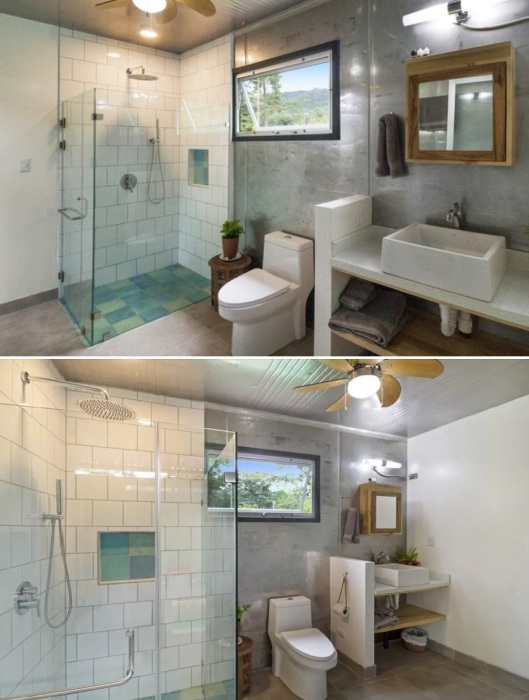 Оставшееся пространство отдано под обустройство полноценной ванной комнаты, без которой не обходится ни одно современное жилище или объект гостеприимства. С двух сторон закрытая стеклом душевая кабина, оригинальная раковина, туалетный стол с двумя полками, небольшой шкафчик со стеклянной дверцей, окно с видом на покрытые зеленью холмы, смывной унитаз – все это дополняет приятную атмосферу гостевого дома, который могут снять любители уединенного отдыха среди первозданной природы. В продолжение темы предлагаем заглянуть в потрясающий контейнерный дом с джакузи на обзорной террасе.