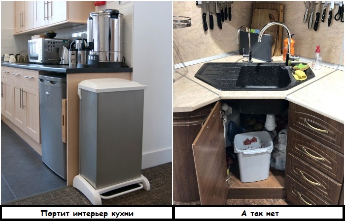 Даже если вы сделали на кухне дорогой ремонт и обновили ее «от» и «до», испортить обстановку может банальная вещь – мусорное ведро, которое стоит на виду. Конечно, намного удобнее выбрасывать обертки, очистки, использованные бумажные полотенца, если ведро стоит рядом с вами, и не нужно открывать дверцы шкафчика. Однако, согласитесь, что выглядит это неэстетично. Угадайте, куда будет устремлен взгляд ваших гостей, когда вы будете сидеть на кухне и пить чай? Правильно.