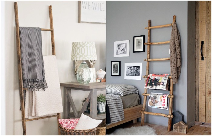 Дизайнеры часто говорят, что для создания уютной атмосферы необходимо большое количество текстиля: шторы, пледы, декоративные подушки. Однако здесь очень легко переборщить, в результате чего комната выглядит неопрятно. Предлагаем подойти к решению вопроса с нестандартной стороны, и дополнить интерьер небольшой декоративной лесенкой. Она не занимает много места и отлично смотрится в углу, который обычно пустует. На ее ступеньках можно не только развесить пледы, но также сложить книги и журналы, расставить цветочные горшки. Получившаяся композиция будет выглядеть очень живописно и эстетично, станет настоящим украшением гостиной. Но не забывайте, что как и любое открытое хранение, лестница будет нуждаться в постоянном поддержании порядка, иначе хаоса избежать не получится.