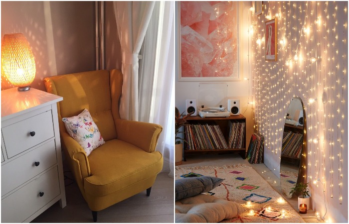 Немаловажную роль в создании уютного интерьера играет освещение. Тени, плохо освещенные углы – все это делает комнату мрачной и отбивает любое желание в ней находиться. Поэтому сразу следует отказаться от одинокой люстры по центру потолка либо «поддержать» ее другими светильниками. Например, на стенах можно разместить бра, около кресла поставить торшер, а возле дивана – настольную лампу. Но самым «уютным» светильником станет гирлянда. И если летом многие могли посчитать ее не слишком уместной, то сейчас, в преддверии зимы, самое время украсить гирляндой шторы или зеркало. Ощущение волшебства и уютной атмосферы не заставит себя долго ждать. Советуем отдавать предпочтение желтому свету, а не холодному белому или голубому – он подарит интерьеру желанное тепло.