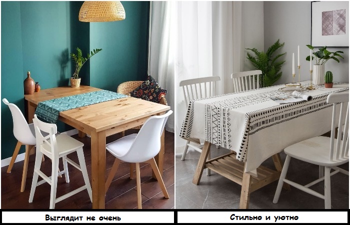 Вы не поверите, но преобразить интерьер кухни, сделать его более красивым, стильным и уютным поможет всего одна деталь – скатерть. Она прикроет трещины и царапины на столешнице, добавит нужный оттенок в цветовую палитру. Вы можете сказать, что это не слишком практично, и скатерть придется часто стирать, однако если выбрать современный вариант с водоотталкивающей пропиткой, проблем практически не будет. Такая скатерть не впитывает влагу, пятна, а потому не сильно загрязняется. Материал выглядит максимально натурально, как лен или рогожка, и даже повторяет их фактуру.