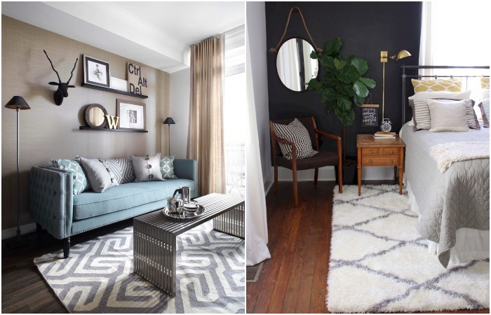 Если вы живете на съемной квартире и хотите замаскировать неудачное напольное покрытие, ковер станет прекрасным решением проблемы. Цена будет зависеть от размера и материала – чем больше площадь, тем, соответственно, дороже. В гостиной лучше постелить большой ковер, чтобы поставить на него всю мебель, которая находится в этой части комнаты, например, диван, кресло и журнальный столик. Так вы визуально разделите пространство на зоны, не используя перегородки.