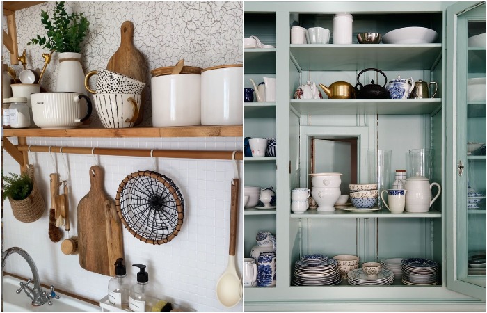 Многие хозяйки придерживаются мнения, что кухня – не место для украшений, особенно если она крохотная. Но ведь декор – это не только статуэтки или постеры, он вполне может быть функциональным. Отличная идея – использовать в интерьере посуду. Достаньте из шкафчика самые красивые тарелки, емкости для хранения, кружки и расставьте их на открытых полках. А если у вас есть сервант со стеклянными дверцами, будет еще лучше. Тогда посуда украсит интерьер, но при этом не станет пылиться и покрываться жирными пятнами. Особенно эстетично будут смотреться тарелки и бокалы в одном цвете или стиле. Но старайтесь собирать «коллекцию» таким образом, чтобы предметы не были слишком пестрыми и не создавали визуальный шум на кухне. Прекрасно впишется в любую обстановку посуда светлого оттенка, но если в интерьере есть яркие вещи, например, шторы или скатерть на столе, можете поставить на открытые полки тарелки в тон – получится гармонично.
