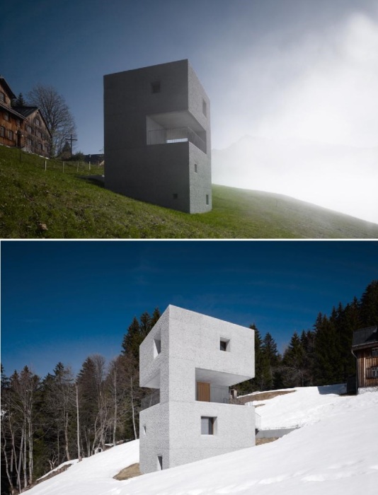 На краю покрытого деревьями ущелья с видом на живописную долину Латернсер благодаря стараниям специалистов студии Marte Architects появился бетонный дом-башня, состоящий из двух уровней. Учитывая правильный выбор локации, каждый из его уровней является смотровой площадкой, откуда отрывается роскошный горный ландшафт. Оригинальный домик является прекрасным образцом использования современных материалов (в данном случае грубого бетона), который выделяется на фоне луговой зелени, а вот в зимнюю пору теряется среди снежного покрова.