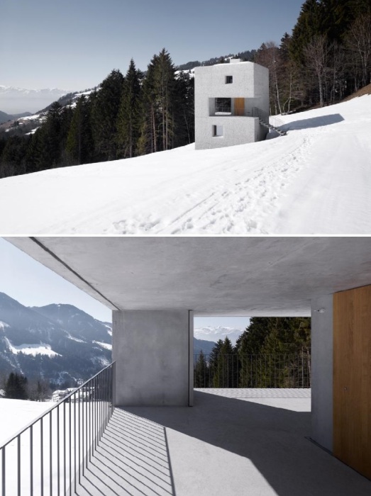 Горный дом-башня, построенный из грубого бетона привлекателен в любое время года (Австрия).