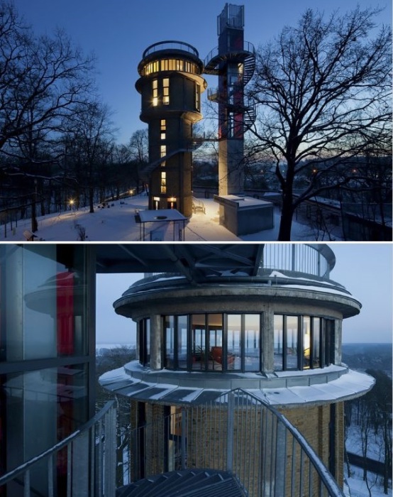 Водонапорная башня, расположенная на холме в окружении деревьев, – мечта любого креативного семейства, стремящегося стать обладателем неординарного дома. Когда такая возможность появилась у супругов из Иоахимсталя, неудивительно, что они взялись за ее трансформацию с особым рвением. Поскольку заброшенный инженерный объект являлся исторической достопримечательностью, существовали ограничения относительно того, что можно, а что нельзя менять в его структуре. Чтобы не нарушить уникальность водонапорной башни, внутри нее была построена новая конструкция, которая и служит современным жилым пространством, а оригинальный объект с винтовой лестницей, появившийся в результате трансформации, стал прекрасным дополнением, выполняя при этом еще и роль лифта.