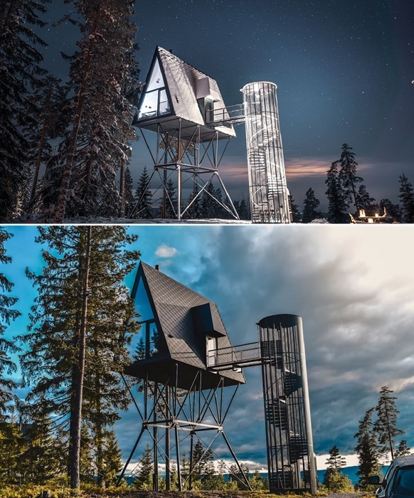 Домики на дереве, установленные на высоких сваях, также можно считать смотровыми площадками, особенно если выбрать правильную локацию. Один из таких, вернее, три одинаковых номера отеля Pan Treetop, затеряны на вершине лесистого холма недалеко от Флисы, что на юге Норвегии. А-образная структура самих объектов, стеклянный фасад и обширные окна, оригинальная винтовая лестница, спрятанная в дощатый кокон – все это гарантирует незабываемые приключения и потрясающий обзор на норвежский сосновый лес Финнскоген.
