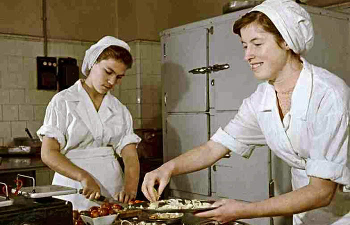 После Октябрьской революции к власти пришли большевики, которые стремились уравнять права всех граждан. Теперь мужчины и женщины имели равные возможности, а значит, представителям прекрасного пола больше не место на кухне. Они тоже могут выбирать себе профессии. А чтобы облегчить быт, нужно было открыть в большом количестве столовых, которые обеспечат питанием население и освободят женщин от готовки. К тому же, общественные кухни станут местом работы для многих советских хозяек. Вовлеченные в работу женщины начнут повышать благосостояние страны. Так, в СССР было принято решение открыть фабрики-кухни, которые смогут накормить все население сбалансированной недорогой едой. А чтобы женщины охотно шли на производство, а мужчины разрешали работать своим женам, на каждом углу были развешены постеры с мотивирующими лозунгами: «Долой кухонное рабство! Даешь новый быт!», «Фабрика-кухня освобождает работницу от домашней кухни!».