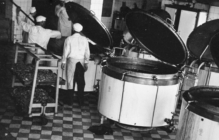 Оборудование на кухне/ фото: centrezotov.ru Теперь сбалансированное питание из свежих продуктов было доступно каждому. Причем, по стоимости выходило дешевле 3-4 раза поесть на такой фабрике-кухне, чем купить продукты домой для приготовления первого и второго блюда. Цены выставляли максимально низкими, а меню было разнообразным. К примеру, отбивная из свинины обходилась в 1.5 рубля, филе из рыбы — 1 рубль, сдобная булочка - 25 копеек, а овощной салатик вообще стоил 3 копейки. За качеством продуктов следили медицинские сотрудники, которые были на каждой кухне.