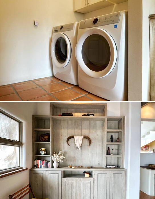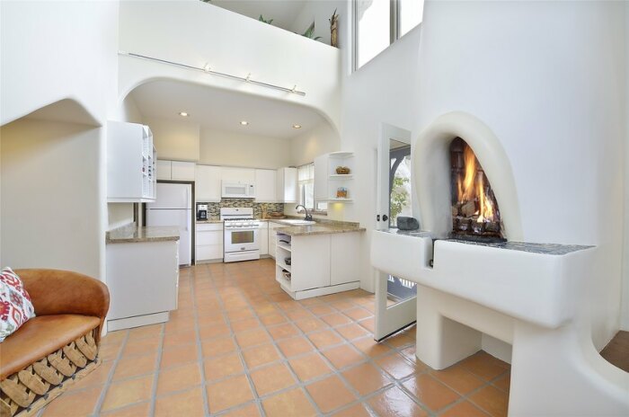 Столовая, как и кухня расположены под мезонинами, но они не кажутся ограниченными в размерах, поскольку потолки не такие уж низкие, да и белый цвет с органичными формами проемов и ниш делают пространства более воздушными и свободными. Поскольку новые владельцы очень любили проводить выходные и отпуск в Casa de Roca, то оборудованию кухни уделили особое внимание. Помимо белоснежного мебельного гарнитура с множеством полок и ящиков для хранения, занимающего все пространство под одним из мезонинов, имеется двухкамерный холодильник, полноразмерная газовая плита с духовым шкафом, встроенная мойка, микроволновая печь, посудомоечная машина и множество мелких гаджетов, ускоряющих процесс приготовления пищи.