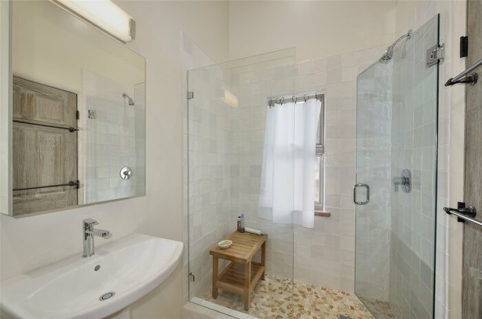 Обновили и ванную комнату, где также преобладают белые тона, который в тандеме с впечатляющей высотой, глянцевой плиткой, большим зеркалом, стеклянными душевыми перегородками и окном создают образ воздушности и простора. Здесь хватит места и для того, чтобы вдвоем принять душ или устроить СПА с омолаживающими косметическими процедурами. Рядом с ванной комнатой предусмотрена прачечная со стиральной и сушильной машинами, так что проблем со стиркой во время отдыха не возникнет.