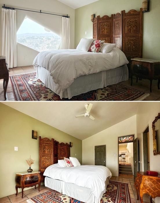 В загородной резиденции Casa de Roca имеется только одна обустроенная спальня, которая располагается в дальнем «валуне». Это, пожалуй, единственное место, где появилась акцентная стена, которая приобрела пастельный оттенок оливы, а у изголовья сохранилась раритетная деревянная перегородка с японскими мотивами, за которой в начале прошлого века прелестные дамы прятались, чтобы переодеться. В спальне остались и антикварные прикроватные тумбы, консольный столик, выступающий в роли бьюти-уголка, шерстяной ковер ручной работы и стильные светильники. Неожиданным украшением стало окно, расположенное по диагонали, что само по себе является нестандартным архитектурным решением.