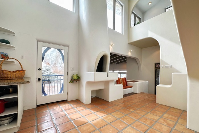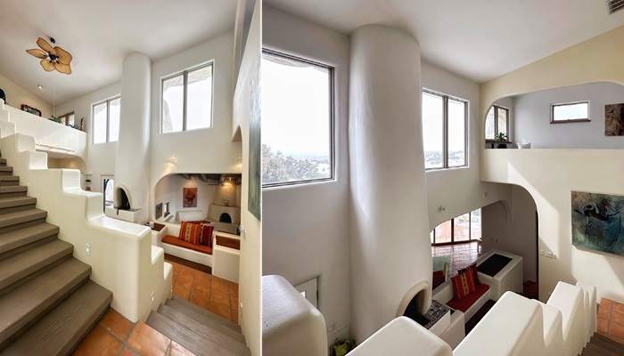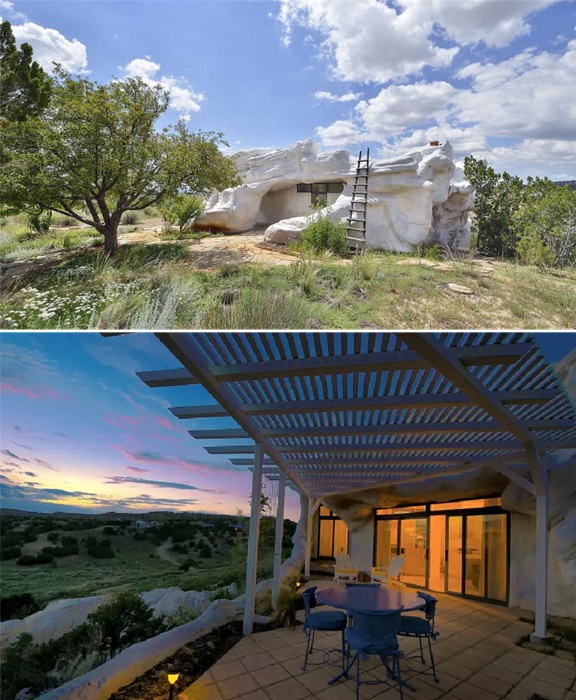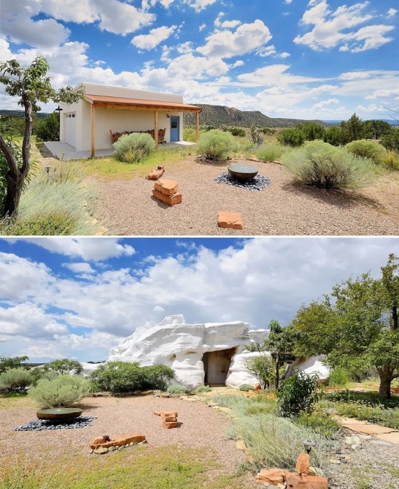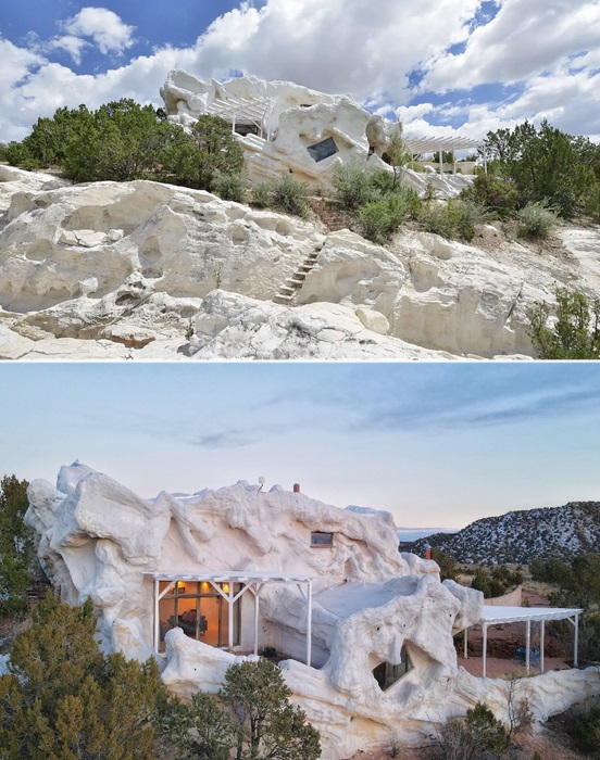 Даже зная, где расположен один из самых удивительных загородных домов штата Нью-Мексико, вряд ли кто сможет его обнаружить среди причудливых скальных образований. А все потому, что креативная пара – удачливый ювелир и известная художница, решили построить совсем необычное убежище, глядя на которое сложно определить, где заканчиваются причудливой формы валуны белой скалы и начинается вполне реальное жилище под названием Casa de Roca.