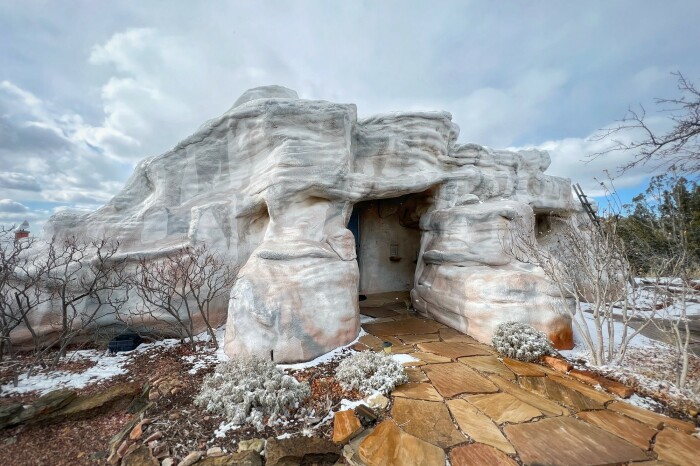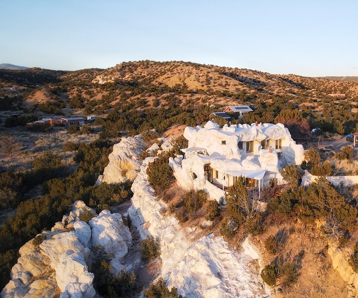 История одного из самых необычных загородных домов Соединенных Штатов началась в 1989 году, когда творческая пара – ювелир и художница, построила жилище больше похожее на белоснежное облако, удобно пристроившееся на краю утеса. Когда шло строительство на известняковых скалах недалеко от Санта-Фе (штат Нью-Мексико), никто даже не подозревал, что обычное с виду строение, стены которого были вложены из шлакоблока, постепенно превратится в художественную инсталляцию, призванную сбивать с толку любого путника.