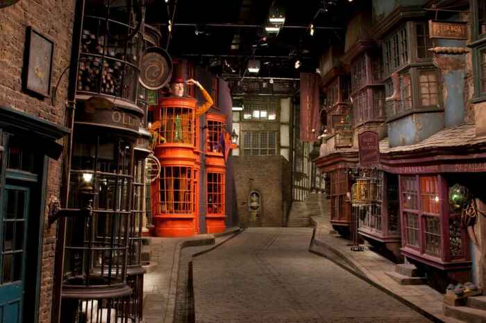 Косой переулок, место, где все волшебники могли купить себе необходимые магические вещи, как для быта, так и для обучения в школе. В нём также было множество волшебных кафе и даже банк. И куда Гарри Поттера приводит его первый друг в волшебном мире - Хагрид. Декорациями для этого места стал реальный крытый рынок Лиденхолл, расположенный в историческом центре Лондона, который был построен в четырнадцатом веке. Он на самом деле очень и очень живописен, имеет потрясающие стеклянные арочные потолки и разнообразные магазины (правда, не волшебные), и естественно идеально подошёл для воссоздания атмосферы магазина волшебных товаров.