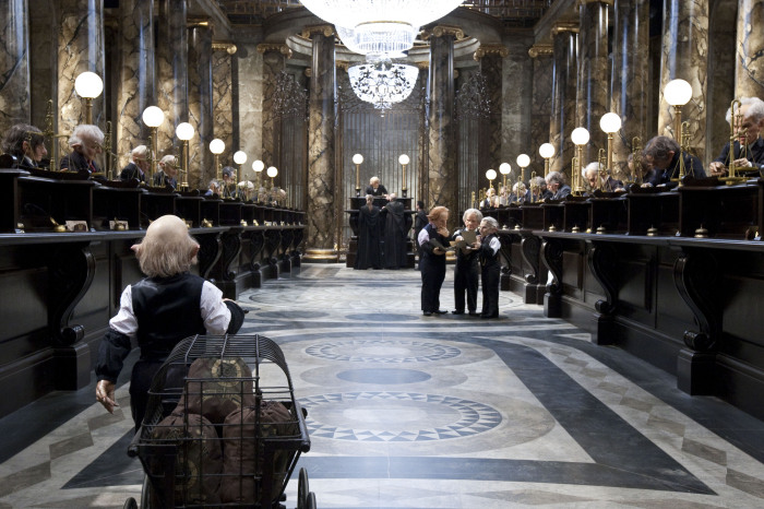 Тот самый банк в котором можно было разменять волшебные деньги или просто забрать их из личного хранилища, а работали там гоблины — Банк Гринготс. В него друг Хагрид привёл Гарри, чтобы тот мог взять денег на покупку вещей для школы. Съемки этих сцен проходили тоже в реально существующем месте — в выставочном зале посольства Австралии, это тоже находится в Лондоне. На самом деле потрясающее место, имеет протяженность 160 футов, и оформление хрустальными люстрами, а также стены выполненные из автралийского мрамора, который в целом весит почти полторы тонны. Всё это продемонстрировало зрителям невероятную роскошь и мощь волшебного банка.